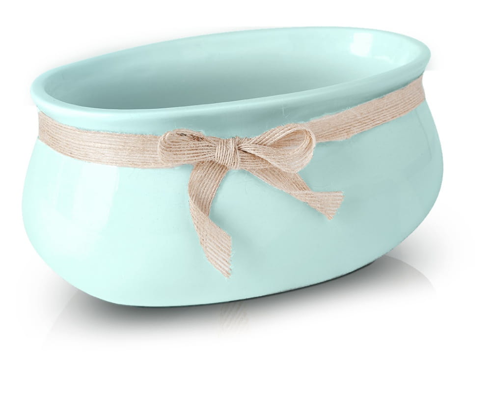 To elegancka, owalna osłonka doniczkowa, której beczułkowaty kształt i ozdobna wstążka dodadzą charakteru każdej roślinie. Wykonana ręcznie z ceramiki szkliwionej, świetnie sprawdzi się jako dekoracyjna oprawa dla roślin w doniczkach produkcyjnych, chroniąc parapet czy stół przed nadmiarem wody.