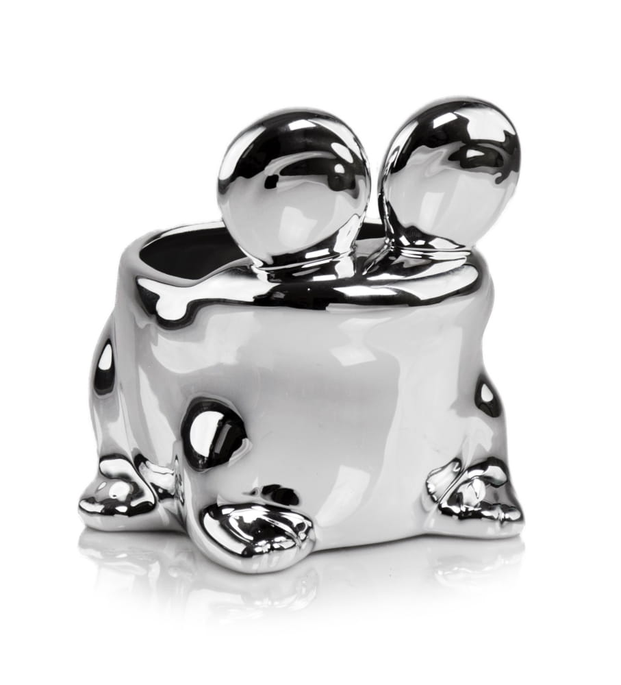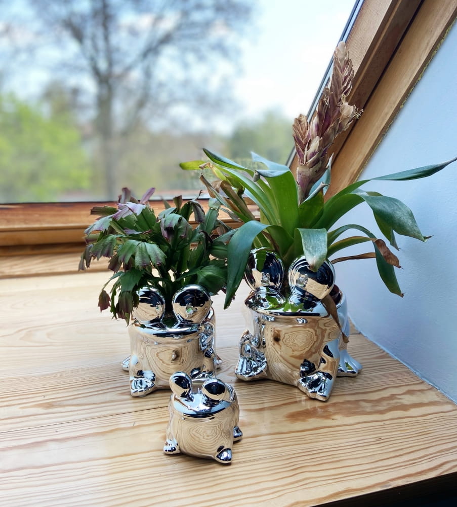 Osłonka Moon to ceramiczna donica w kształcie uśmiechniętej żabki, która swoim radosnym wyglądem ożywi każde wnętrze. Jej lustrzano-srebrna powierzchnia, osiągnięta dzięki galwanoplastyce, odbija światło i otoczenie, dodając przestrzeni blasku. To idealny wybór dla tych, którzy szukają zabawnej i funkcjonalnej dekoracji do pokoju dziecka lub oryginalnego prezentu.