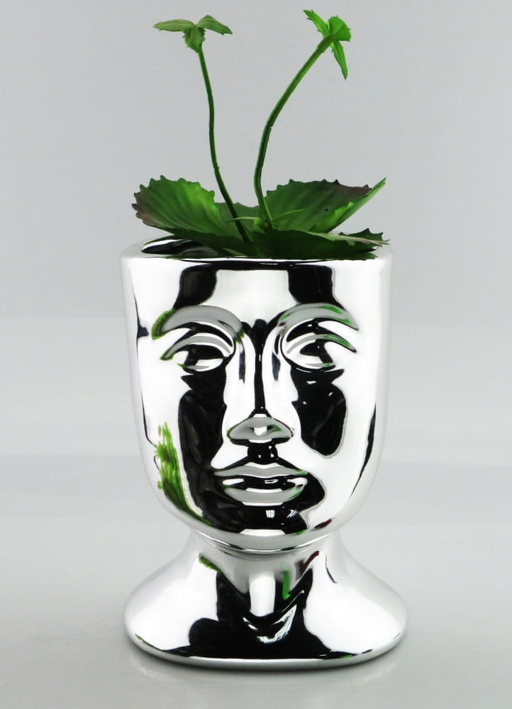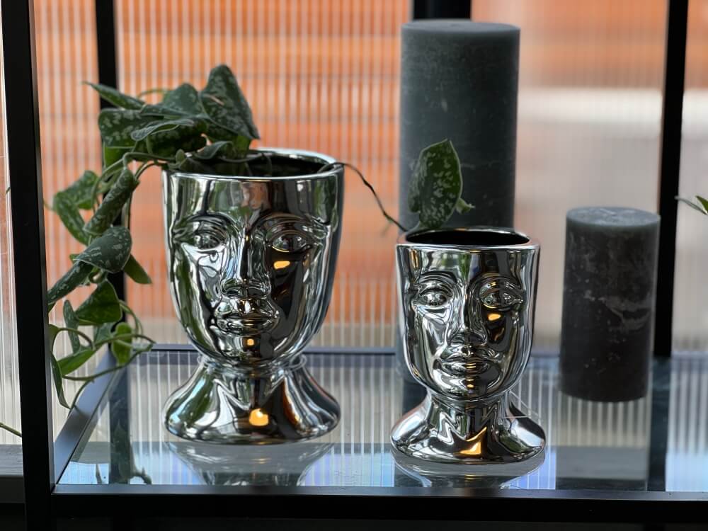 Postaw w niej sukulenty, małe kaktusy lub inne rośliny doniczkowe o zwartym pokroju – ich zielony kontrast z metalicznym srebrem będzie wyglądał wyjątkowo efektownie. Ze względu na brak informacji o mrozoodporności, rekomendujemy użytkowanie tej osłonki wyłącznie we wnętrzach. Sprawdzi się jako intrygująca ozdoba na półce, komodzie w salonie, sypialni lub nawet w nowoczesnej łazience.