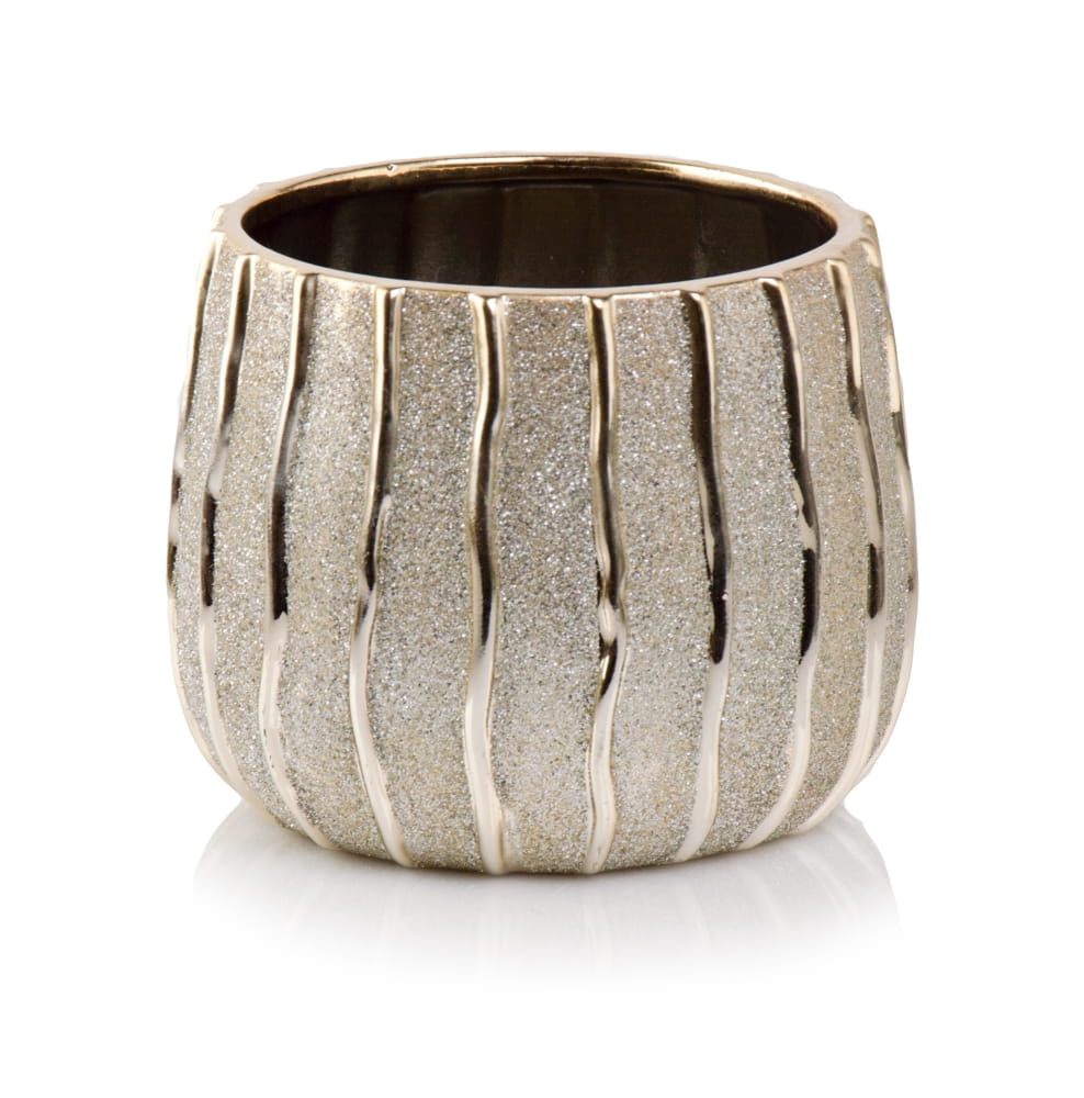 Elegancka, okrągła osłonka, która dzięki ręcznemu wykonaniu z ceramiki szkliwionej, nabiera wyjątkowego, głębokiego połysku. Jej subtelne, pionowe paski i delikatny brokat w kolorze złota nadają jej charakteru, dzięki czemu sama w sobie stanowi piękną dekorację, idealnie dopełniającą zarówno klasyczne, jak i nowoczesne wnętrza.