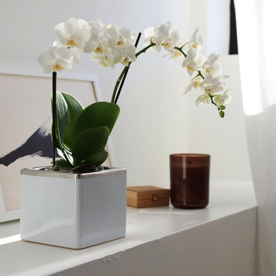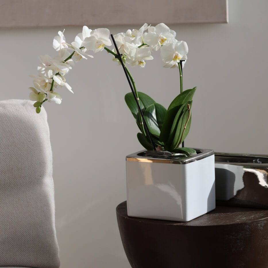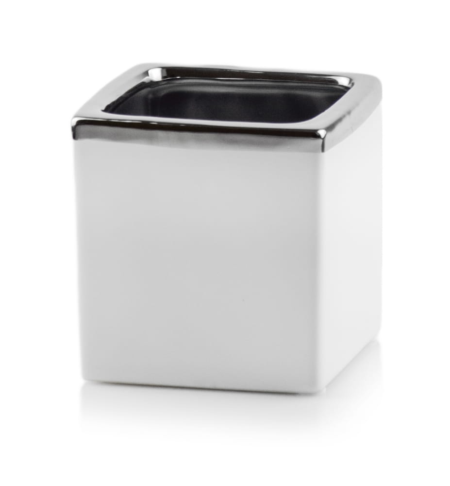 Ta mała, kwadratowa osłonka to elegancki dodatek do wnętrz, który łączy klasyczną biel z metalicznym połyskiem srebra. Należy do kolekcji Moon, stworzonej z myślą o osobach ceniących styl glamour i wyrafinowane detale. Dzięki cienkościennemu wykonaniu z ceramiki i lustrzanemu wykończeniu stanowi uniwersalny element dekoracyjny.