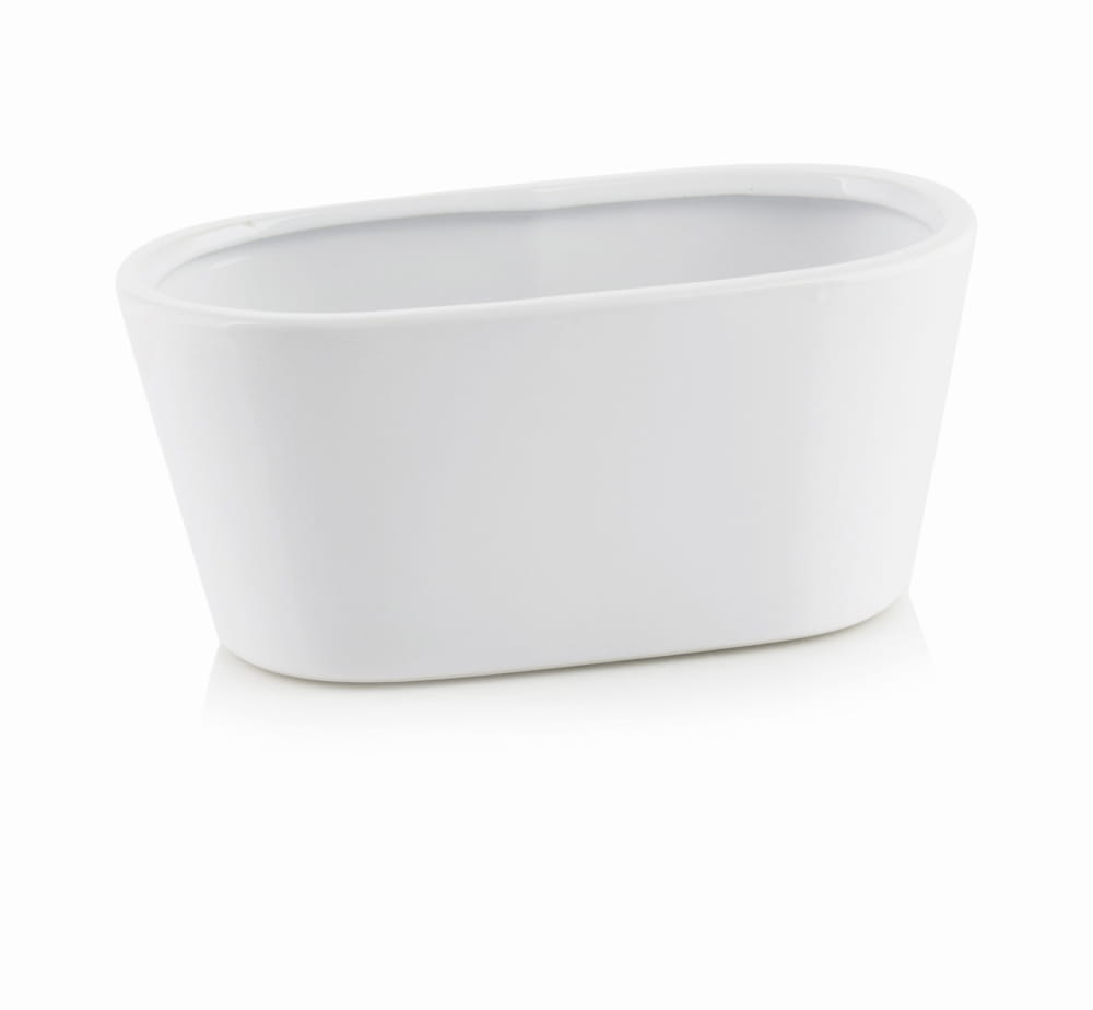 To podłużna osłonka o eleganckim, owalnym kształcie, która doskonale wpisuje się w nowoczesne aranżacje wnętrz. Wykonana ręcznie z ceramiki pokrytej gładkim, błyszczącym szkliwem w czystym białym kolorze, stanowi uniwersalny detal dekoracyjny.