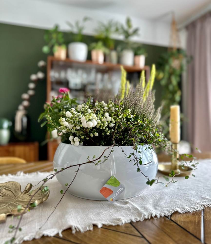 - Okrągła, niska forma → Sprawdzi się jako podstawa dla kompaktowych roślin lub niskich kompozycji florystycznych, zachowując proporcje.