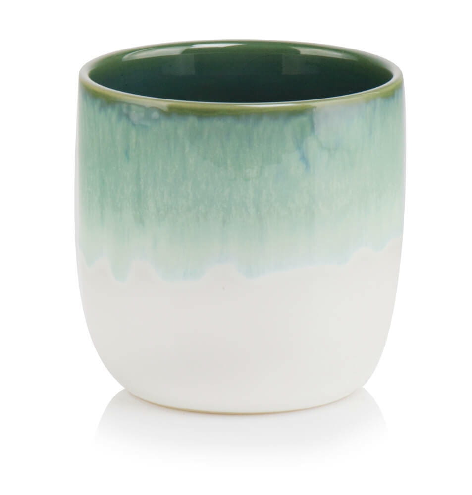 Ta okrągła osłonka wykonana jest z ręcznie szkliwionej ceramiki, dzięki czemu zyskuje subtelny, lśniący wygląd. Jej główną ozdobą jest charakterystyczne cieniowanie oraz efekt pękającego szkliwa (crackle), które nadają jej niepowtarzalnego, vintage'owego uroku. Sprawdzi się jako elegancka oprawa dla roślin doniczkowych w różnych stylach wnętrz.