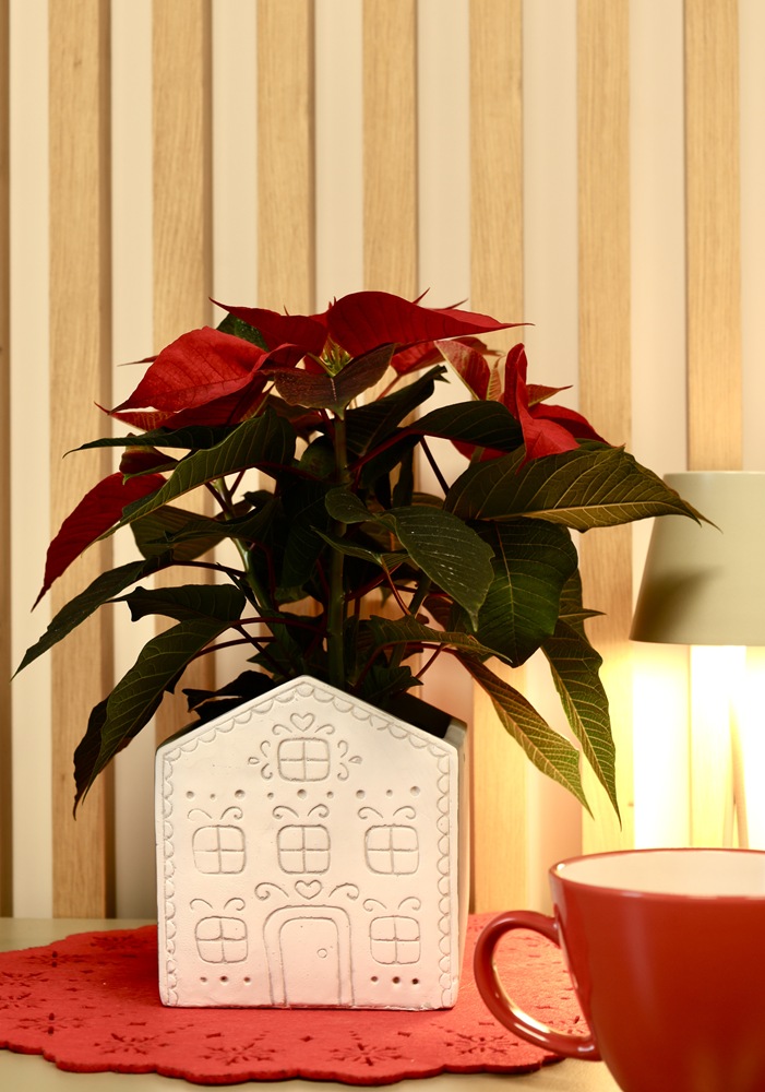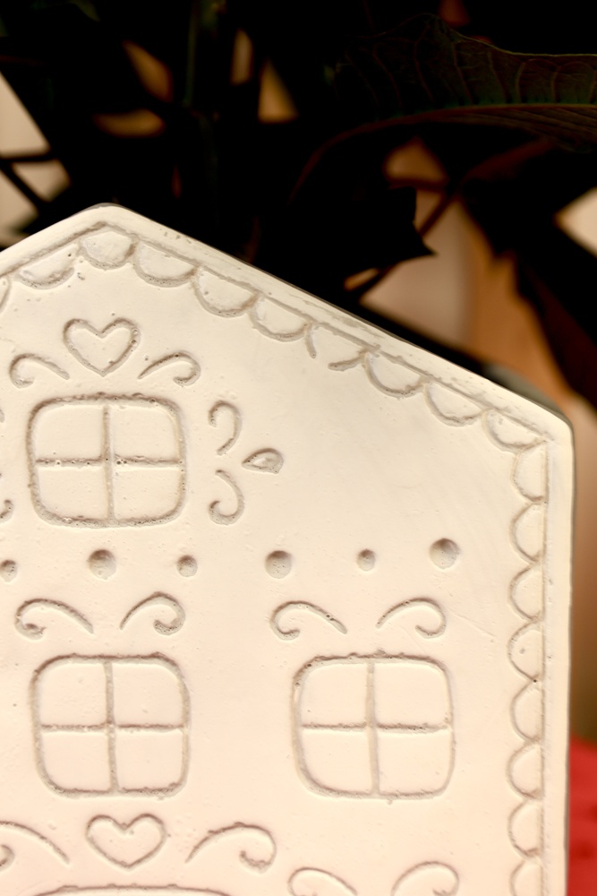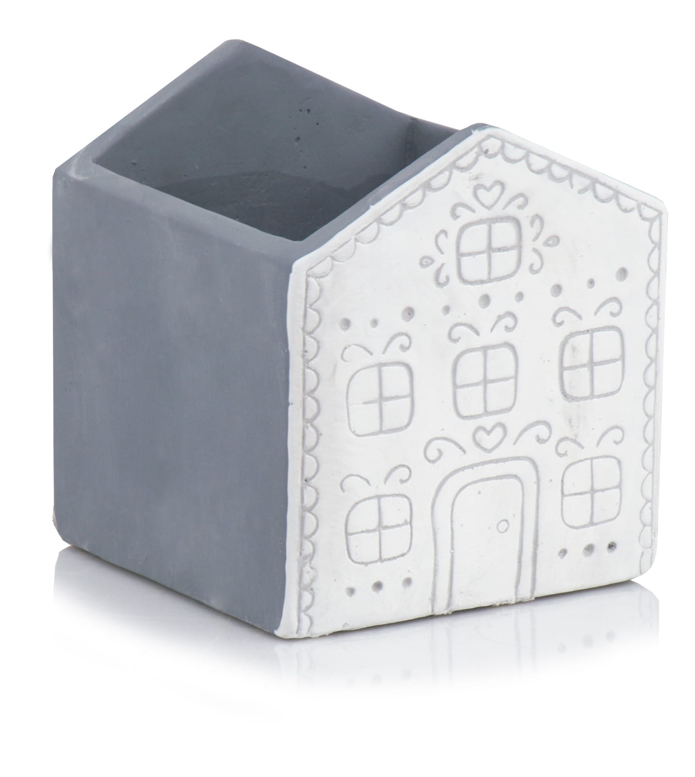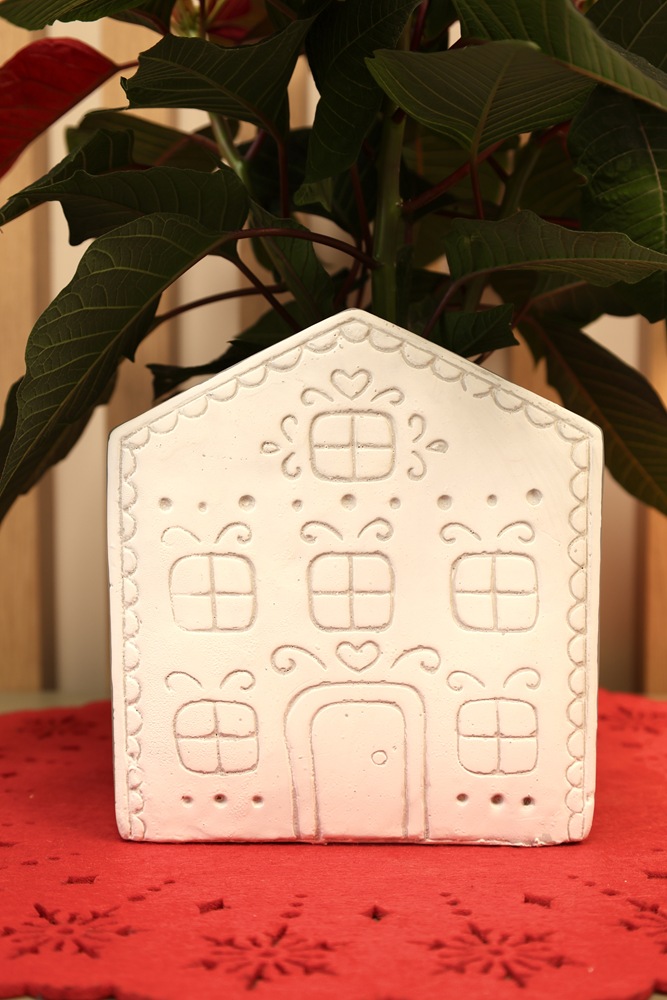 Ceramiczna osłonka doniczkowa w kształcie domku. Fasada domku wzorowana jest na piernikowych, ciasteczkowych zdobieniach. Doniczka wymarzona do bożonarodzeniowych kompozycji z gwiazdą betlejemską, tworząca razem bajkowy, pełen uroku komplet. W towarzystwie podobnych kolorystycznie skrzatów Victora i Vincenta uzyskujemy wyjątkową, odmienną od wszystkich dekorację świąteczną.