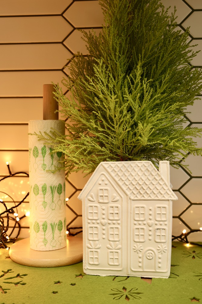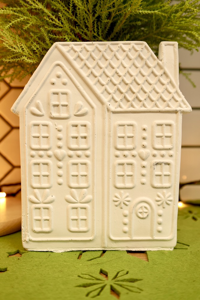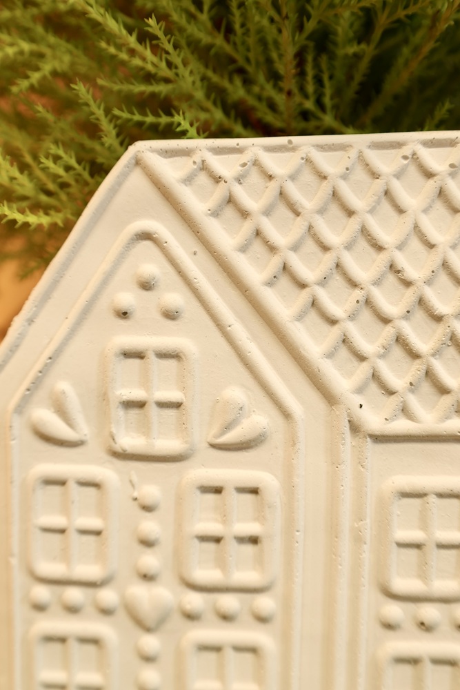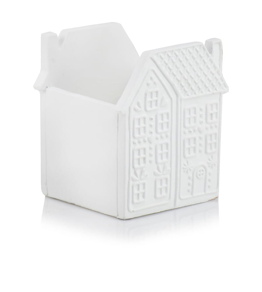 Ceramiczna osłonka doniczkowa w kształcie domku. Fasada domku wzorowana jest na piernikowych, ciasteczkowych zdobieniach. Śnieżno-biała ceramika pięknie i subtelnie podkreśla jej bajkowy charakter. Doniczka wymarzona do bożonarodzeniowych kompozycji z gwiazdą betlejemską, tworząca razem pełen uroku komplet. W towarzystwie podobnej kolorystycznie figurki trzech choinek Conifera triple uzyskujemy wyjątkową, odmienną od wszystkich dekorację świąteczną.