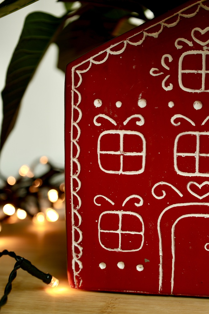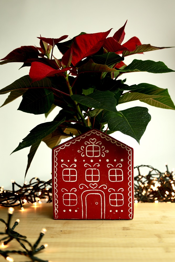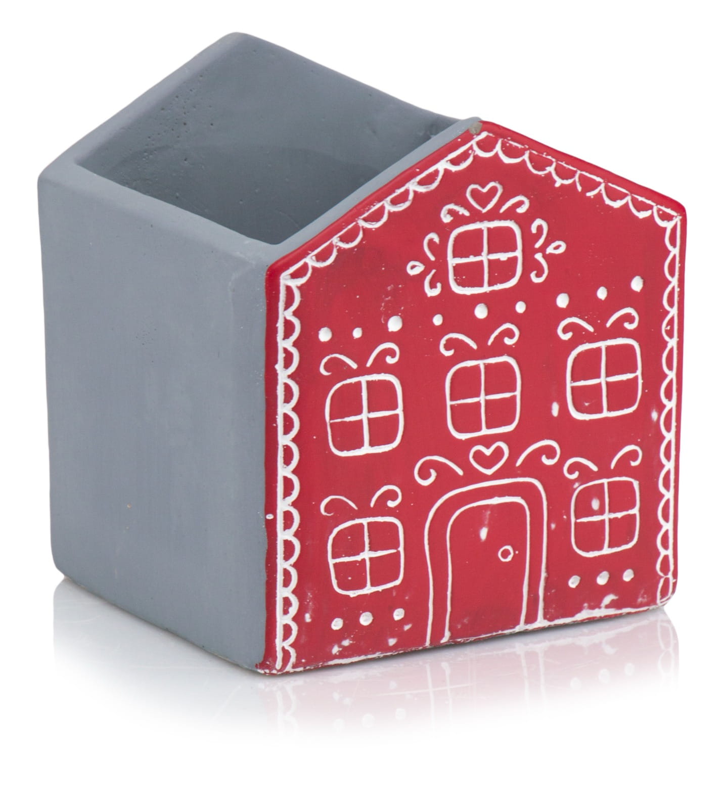 Ceramiczna osłonka doniczkowa w kształcie domku. Fasada domku wzorowana jest na piernikowych, ciasteczkowych zdobieniach. Doniczka wymarzona do bożonarodzeniowych kompozycji z gwiazdą betlejemską, tworząca razem bajkowy, pełen uroku komplet. W towarzystwie podobnych kolorystycznie skrzatów Victora i Vincenta uzyskujemy wyjątkową, odmienną od wszystkich dekorację świąteczną.
