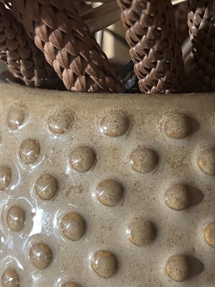 Ceramiczna osłonka doniczkowa o zwężającym się ku górze, prawie kulistym kształcie, osłonka może służyć z powodzeniem również jako wazonik. Usiana wypukłymi wypustkami jak piegami. Uroku doniczce dodaje oparcie najbardziej pękatej, zaokrąglonej dolnej części dolnej na krótkiej i wąskiej podstawie. Czuje się tu lekkość formy i wyrafinowaną prostotę. Jest to propozycja bardzo stylowa i oryginalna, zaskakująca i charakterystyczna.