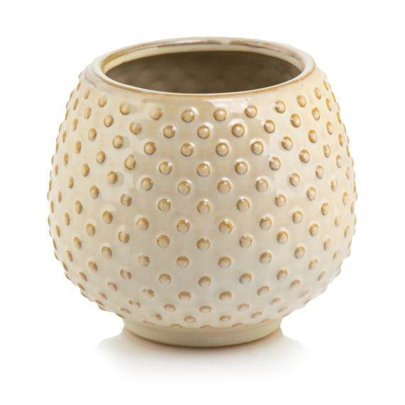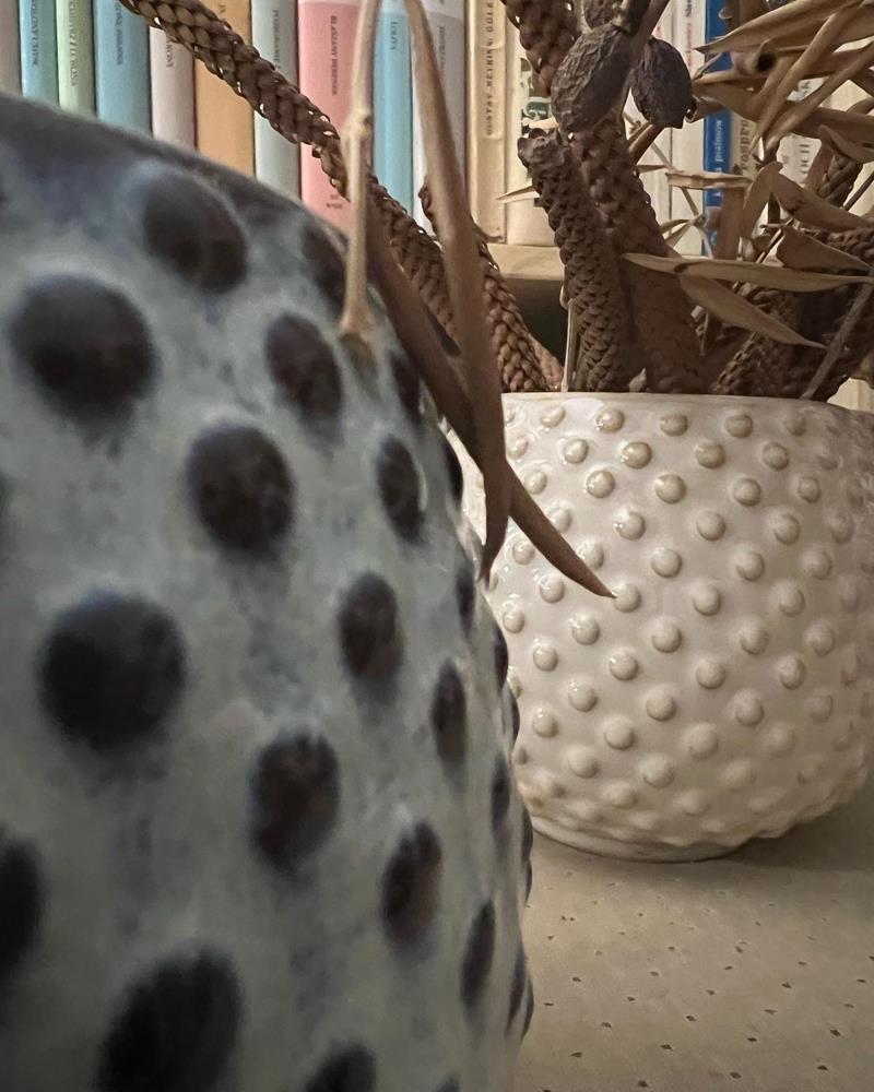 Ceramiczna osłonka doniczkowa o zwężającym się ku górze, prawie kulistym kształcie, osłonka może służyć z powodzeniem również jako wazonik. Usiana wypukłymi wypustkami jak piegami. Uroku doniczce dodaje oparcie najbardziej pękatej, zaokrąglonej dolnej części dolnej na krótkiej i wąskiej podstawie. Czuje się tu lekkość formy i wyrafinowaną prostotę. Jest to propozycja bardzo stylowa i oryginalna, zaskakująca i charakterystyczna.