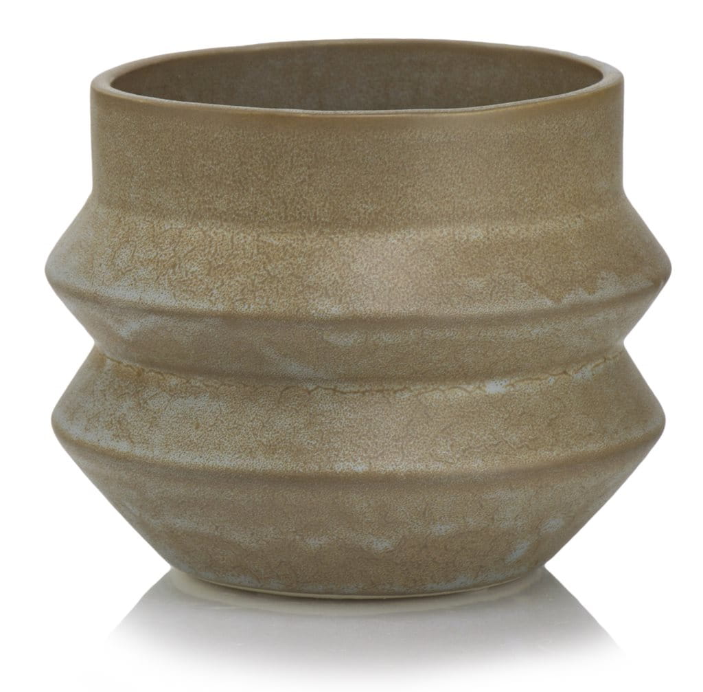 Ceramiczna osłonka doniczkowa o bardzo przyjemnym dla oka przestrzennym charakterze. Uwagę przykuwa ciepła brązowa zmiksowana z błękitem kolorystyka, subtelnie korespondująca z zielenią roślin. Wzornictwo o perfekcyjnie rozplanowanych proporcjach, w których prostota ścian idealnie współgra z poziomymi, ozdobnymi wybrzuszeniami. Jest to propozycja spójna, naturalna i szlachetna w swojej stylistyce, stanowiąca trwały i ponadczasowy akcent o nietuzinkowym wyglądzie.