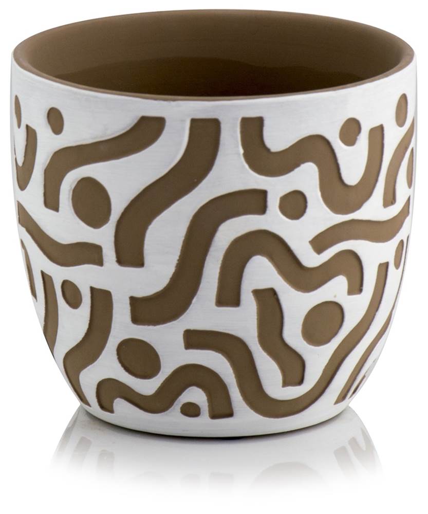 Ceramiczna osłonka doniczkowa o bardzo wyrazistym, mocnym, ale niepozbawionym finezji i lekkości wzornictwie. Abstrakcyjne esy-floresy prezentujące się w pięknie kontrastujących ze sobą kolorach bieli i ciemnego beżu. Dla miłośników wysmakowanej prostoty, niecodziennego wzornictwa, wyczucia formy i koloru w idealnych proporcjach.