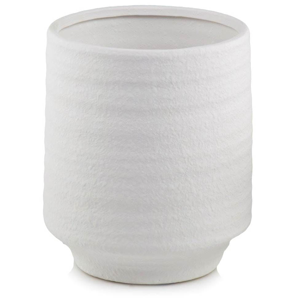 Ceramiczna osłonka doniczkowa w kształcie walca delikatnie zwężającego się ku górze, dół z nadającym doniczce lekkości ostrym podcięciem. Powierzchnia zewnętrzna pokryta jest delikatnym frezowaniem, przypominający ceramikę formowaną ręcznie na kole garncarskim. Biała kolorystyka nadaje doniczce powiewu świeżości i czystości. Biel jest kolorem neutralnym i uniwersalnym, harmonijnie odnajdującym się w wielu aranżacjach. Jest to propozycja stonowana, szlachetna w swoim wyrazie, prosta w formie, cechy te stanowią o jej dużym dekoracyjnym potencjale.