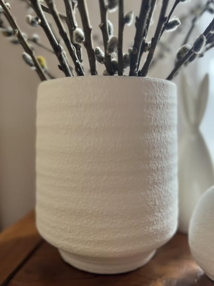 Ceramiczna osłonka doniczkowa w kształcie walca delikatnie zwężającego się ku górze, dół z nadającym doniczce lekkości ostrym podcięciem. Powierzchnia zewnętrzna pokryta jest delikatnym frezowaniem, przypominający ceramikę formowaną ręcznie na kole garncarskim. Biała kolorystyka nadaje doniczce powiewu świeżości i czystości. Biel jest kolorem neutralnym i uniwersalnym, harmonijnie odnajdującym się w wielu aranżacjach. Jest to propozycja stonowana, szlachetna w swoim wyrazie, prosta w formie, cechy te stanowią o jej dużym dekoracyjnym potencjale.