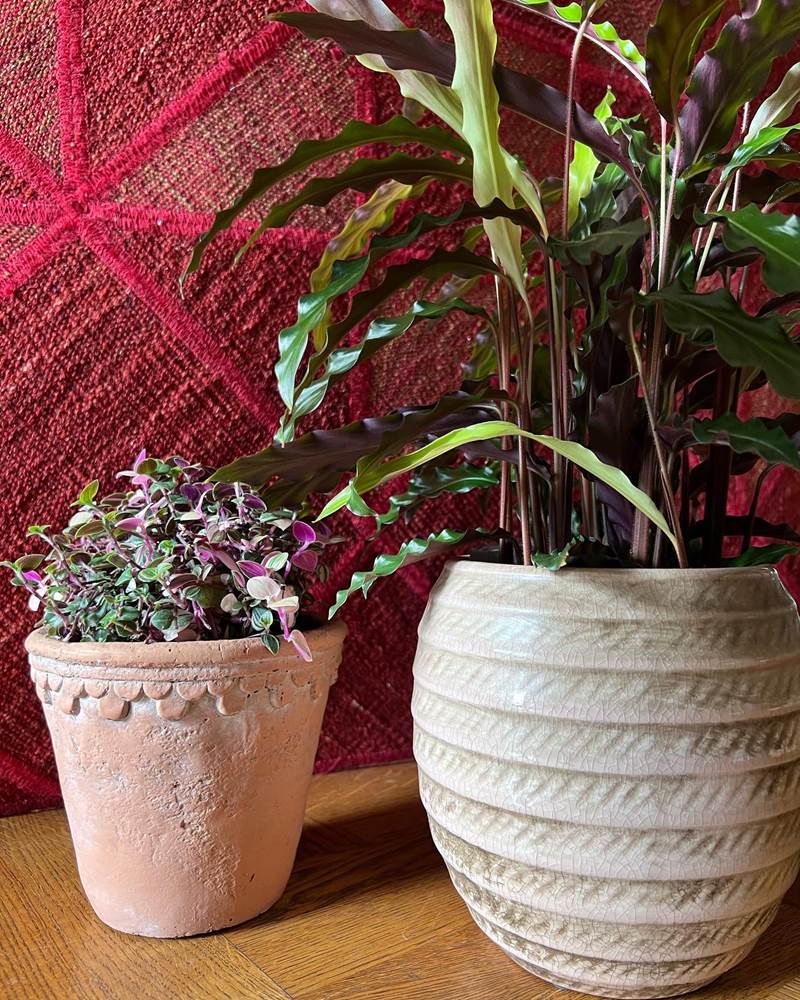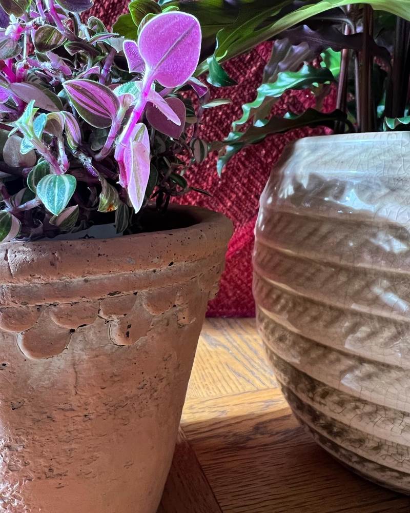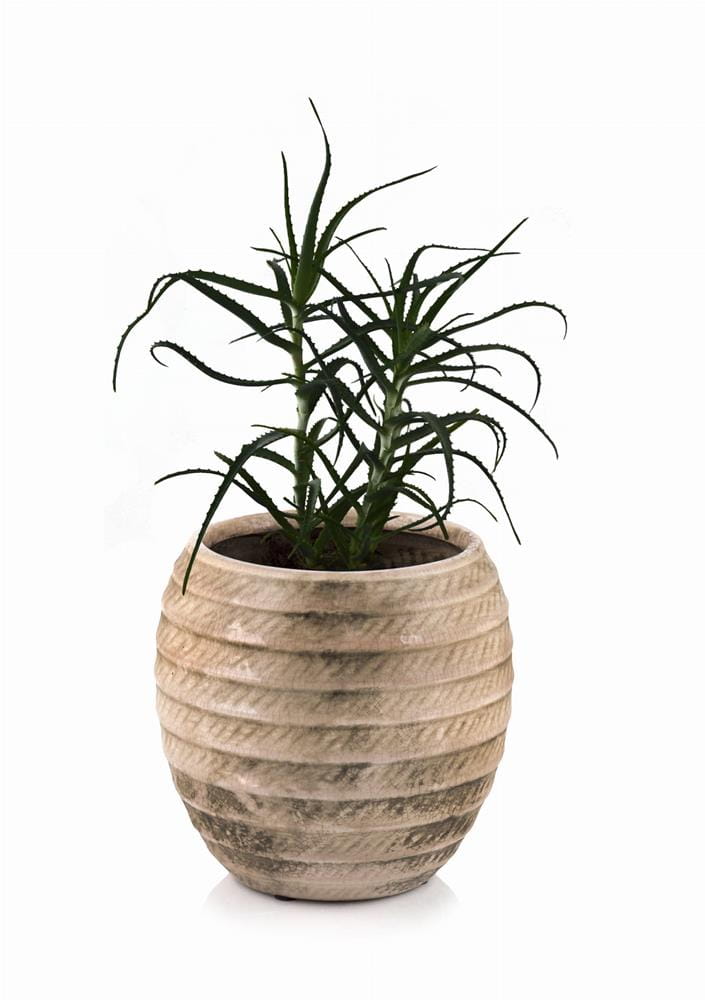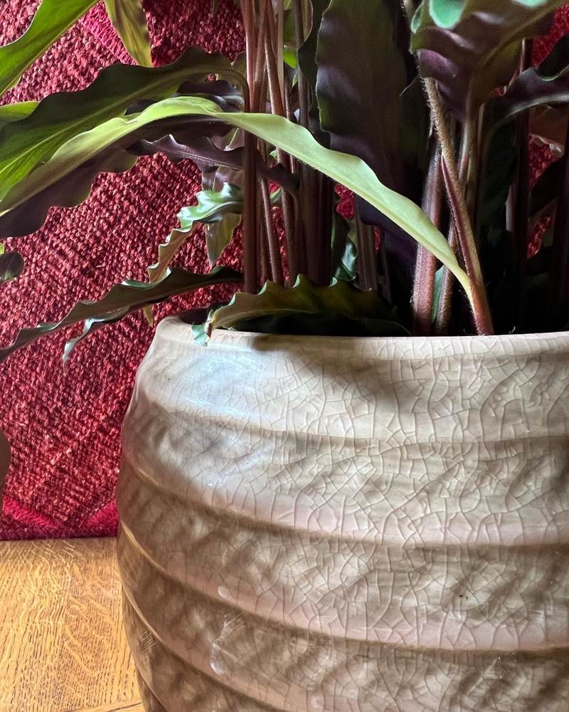 Ceramiczna osłonka doniczkowa kształtem przypominająca beczułkę. Zewnętrzna faktura z poziomymi tłoczonymi prążkami. Szkliwo z licznymi drobnymi celowymi pęknięciami dodającymi uroku i szlachetności. Doniczka zwraca uwagę pastelowym, łososiowym różem przydymionym szarością. Wzór i kolor tworzą harmonijną uzupełniającą się całość. Dla miłośników zdecydowanych, ale niekrzykliwych i subtelnych akcentów dekoracyjnych.