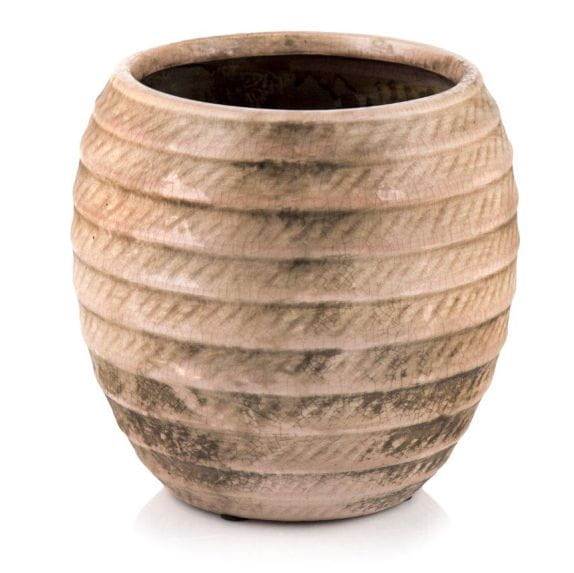 Ceramiczna osłonka doniczkowa kształtem przypominająca beczułkę. Zewnętrzna faktura z poziomymi tłoczonymi prążkami. Szkliwo z licznymi drobnymi celowymi pęknięciami dodającymi uroku i szlachetności. Doniczka zwraca uwagę pastelowym, łososiowym różem przydymionym szarością. Wzór i kolor tworzą harmonijną uzupełniającą się całość. Dla miłośników zdecydowanych, ale niekrzykliwych i subtelnych akcentów dekoracyjnych.