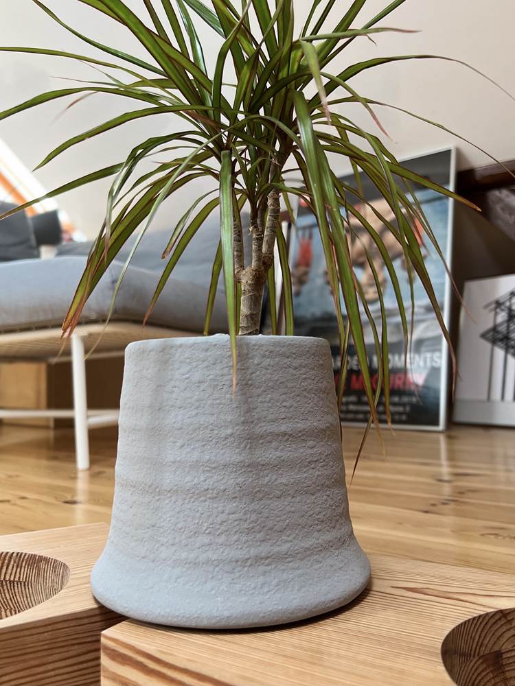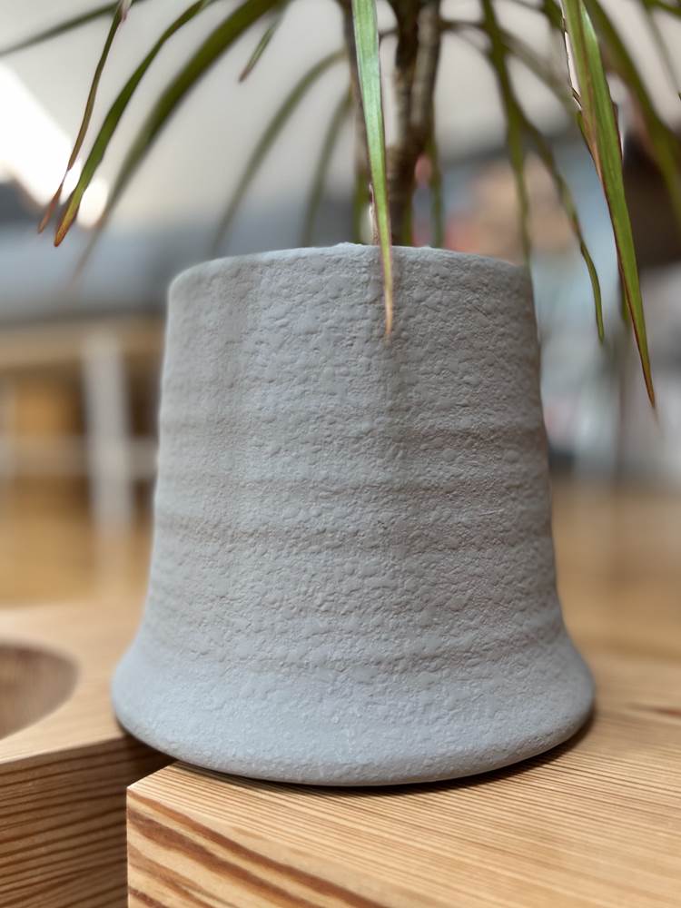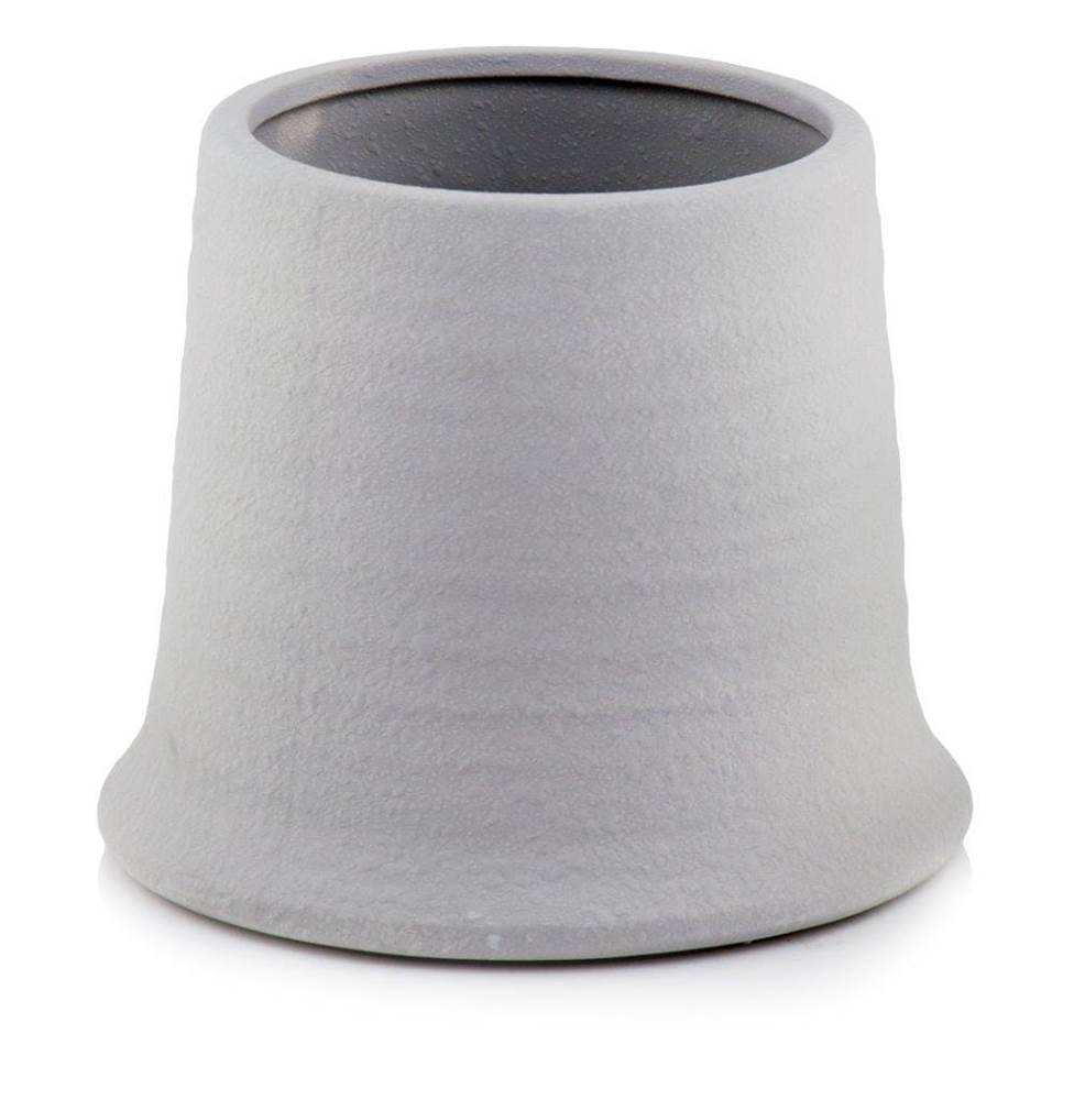 Ceramiczna osłonka doniczkowa o bardzo ciekawym, nietuzinkowym kształcie przypominającym krawiecki naparstek. Powierzchnia zewnętrzna pokryta jest delikatnym frezowaniem, przypominający ceramikę formowaną ręcznie na kole garncarskim. Biała kolorystyka nadaje doniczce powiewu świeżości i czystości. Szarość jest kolorem neutralnym i uniwersalnym, harmonijnie odnajdującym się w wielu aranżacjach. Jest to propozycja stonowana, szlachetna w swoim wyrazie, prosta w formie, cechy te stanowią o jej dużym dekoracyjnym potencjale.