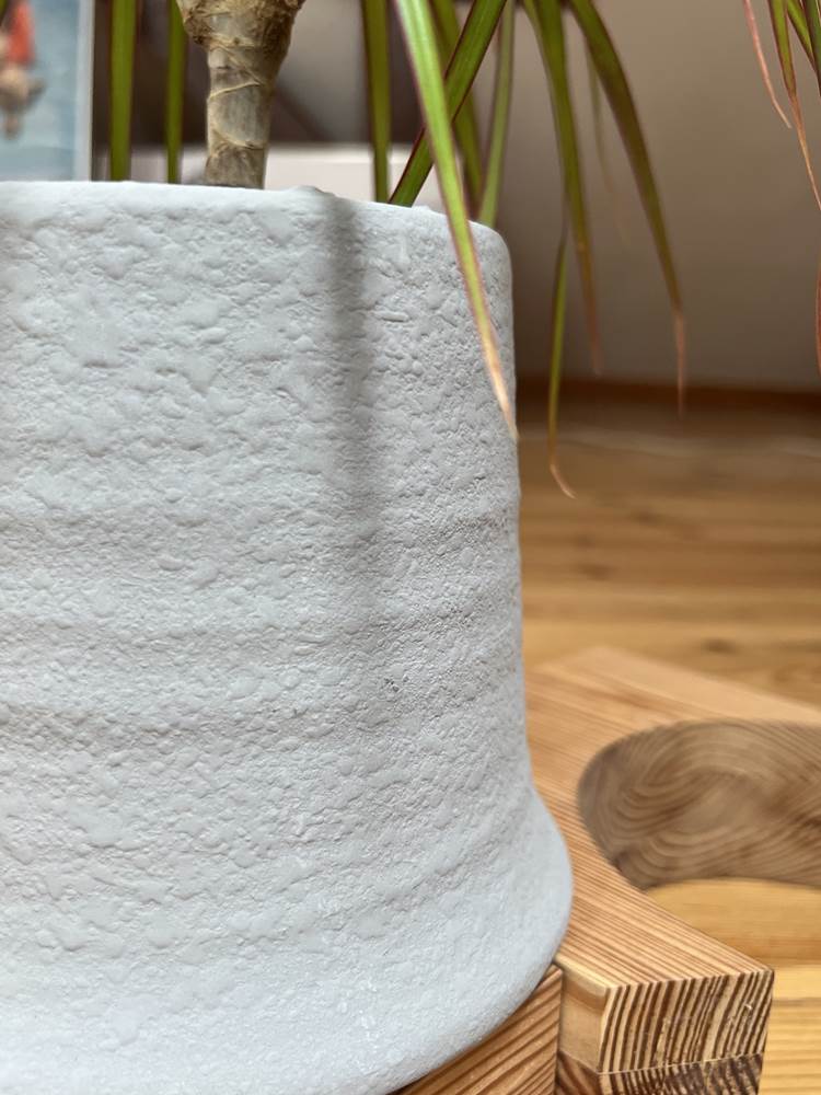 Ceramiczna osłonka doniczkowa o bardzo ciekawym, nietuzinkowym kształcie przypominającym krawiecki naparstek. Powierzchnia zewnętrzna pokryta jest delikatnym frezowaniem, przypominający ceramikę formowaną ręcznie na kole garncarskim. Biała kolorystyka nadaje doniczce powiewu świeżości i czystości. Szarość jest kolorem neutralnym i uniwersalnym, harmonijnie odnajdującym się w wielu aranżacjach. Jest to propozycja stonowana, szlachetna w swoim wyrazie, prosta w formie, cechy te stanowią o jej dużym dekoracyjnym potencjale.