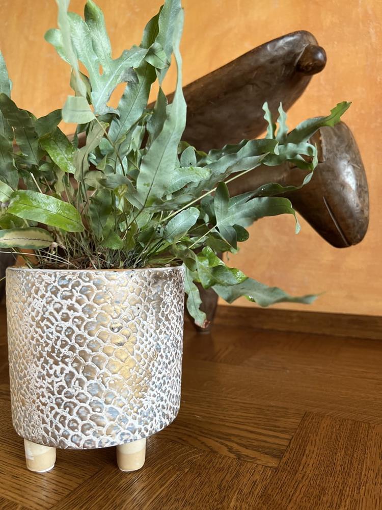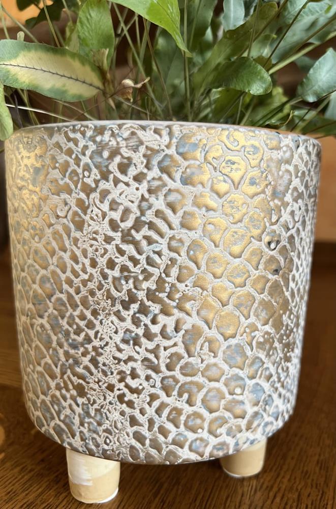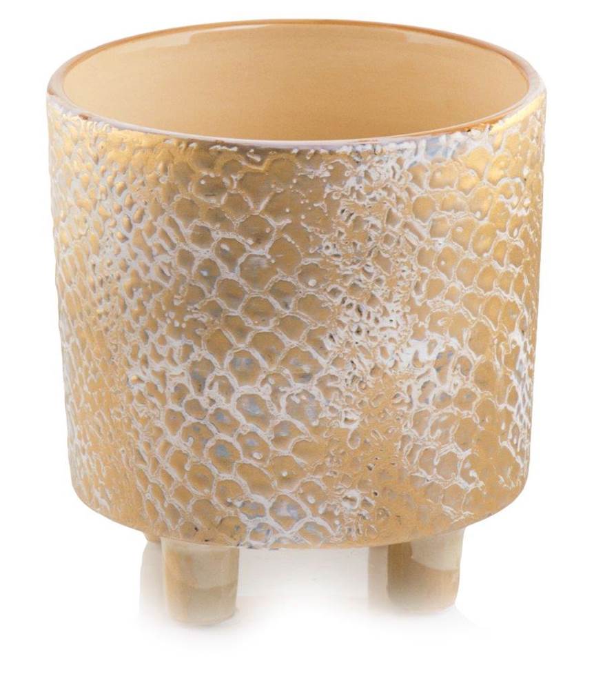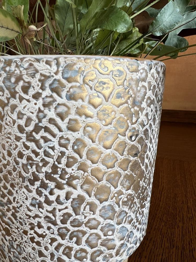 Ceramiczna osłonka doniczkowa w kształcie walca na czterech zgrabnych, nadających jej lekkości nóżkach. Doniczka o wyjątkowej urodzie i maestrii wykonania. Piękne wzornictwo z tłoczeniami inspirowanymi skórą węża, interesująca kolorystyka z użyciem wielu harmonijnie dobranych kolorów, tworzących urzekającą mozaikę bieli, beżów i złoto- miedzianych odcieni. Doniczka urzeka innością, nietypowością połączoną z wysoką jakością wykonania. Doniczka przykuwająca wzrok, niedająca się pominąć, będąca mocnym punktem każdej aranżacji.