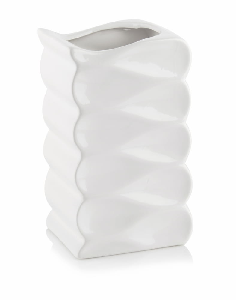 To ręcznie wykonany wazon ceramiczny, który wyróżnia się niezwykłą, falistą strukturą, nadającą mu wyjątkowy, rzeźbiarski charakter. Jego klasyczny, biały kolor i błyszczące wykończenie sprawiają, że będzie elegancką ozdobą każdego wnętrza, idealnie prezentującą zarówno pojedyncze gałązki, jak i niewielkie bukiety.