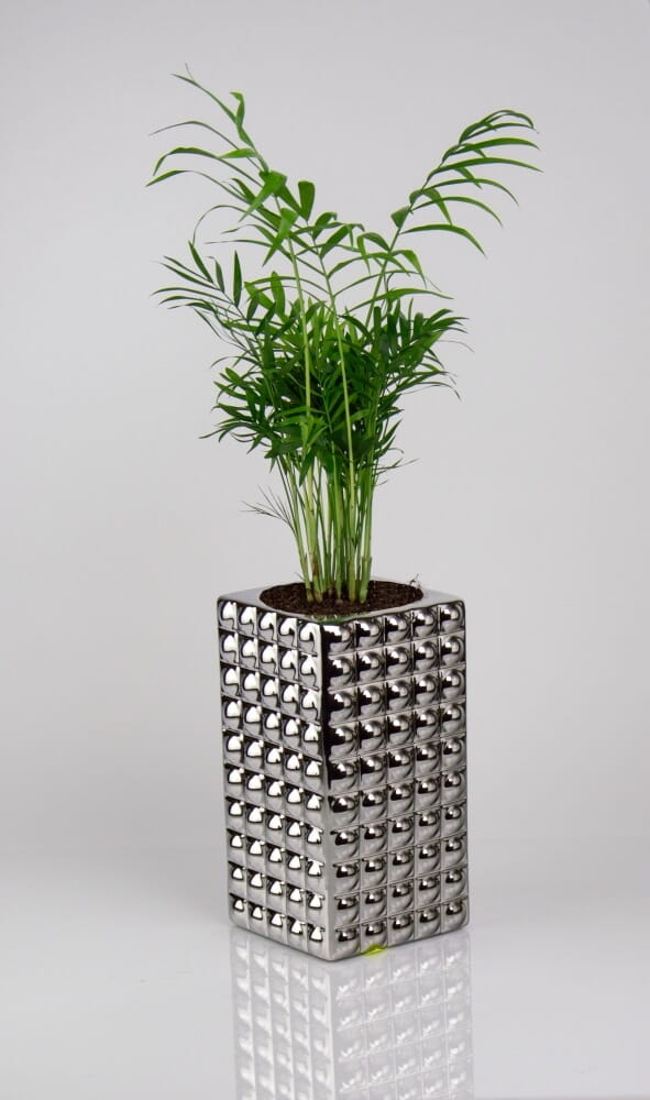 - Wykończenie "Full-silver" → Elektrolityczna powłoka srebrna pokrywa cały wazon, łącznie z jego wnętrzem, zapewniając spójny, metaliczny charakter i głębię odbicia.